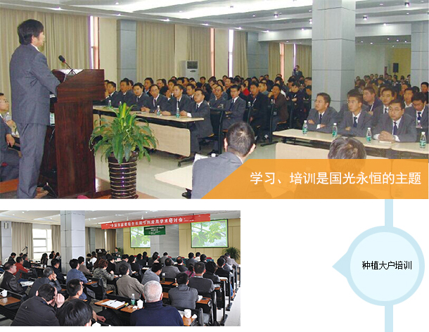 董事長原來是師范校的教師,他把教書育人也帶到了國光企業,從創業初期就重視對員工進行培訓,而且還編寫技術資料對經銷商和用戶進行培訓。早年的手寫保鮮劑資料就是一個例證,創業至今從沒有停止過對員工和用戶的培訓,每年新生入公司要進行至少一個月的培訓,員工每兩個月要培訓一次,年底全體員工還要學習培訓近一個月。不僅對員工是這樣,國光每年 還把經銷商、種植戶請到公司來培訓學習。國光每年10月份起各種培訓會議就不斷。這種學習 文化、學習型企業不僅培養了大量的優秀員工和經銷商,還給種植戶和同行留下了深刻的印象, 稱國光是業內的黃浦軍校。