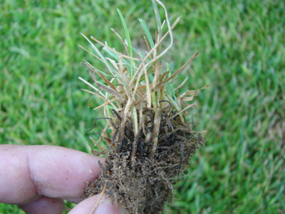 拔出“剛”感病的草坪草,發(fā)現根部、根莖部已黑褐色腐爛,且植株會輕輕拔起