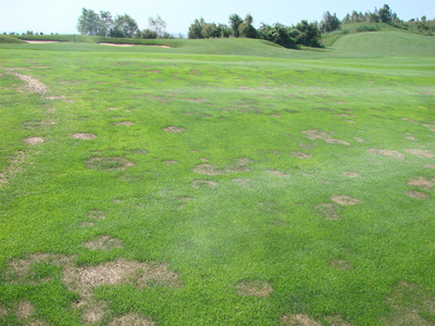 夏季斑是典型的根部病害,根系先感病,則植株不長,導致感病區(qū)出現凹陷的草圈,并逐漸枯死。